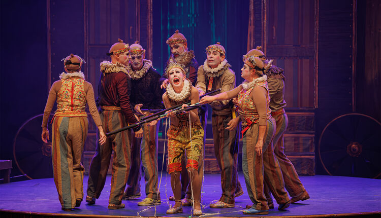 Livremente inspirado no ensaio “Sobre o Teatro de Marionetes”, de Heinrich von Kleist, o espetáculo dialoga com as gags (esquetes humorísticas do universo circense) e com a peça “Os Gigantes da Montanha”, de Luigi Pirandello. Em cena, os bailarinos transitam entre o humano e o fantasmagórico, incorporando a metáfora das marionetes para refletir sobre a condição existencial do homem.
