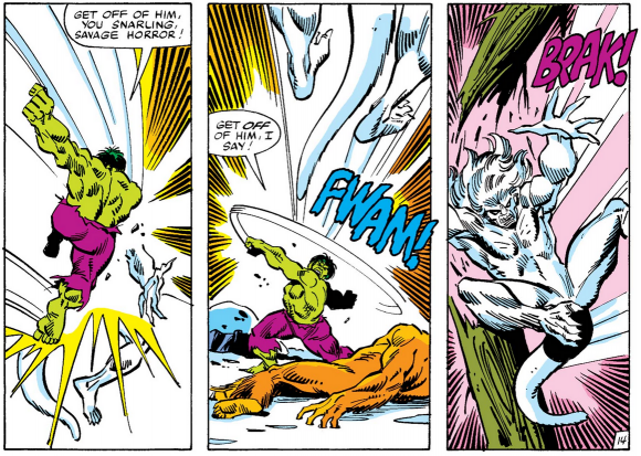 Ler suas páginas era se deparar com muitos “Pow!”, “Throom!!” e “Kwaadoom!!!”, onomatopeias em profusão, além de personagens praticamente “voando” após levar uma porrada do Hulk. A arte de Sal casou muito bem com a fase intempestiva do Gigante Esmeralda. É um desenho explosivo, rápido e furioso.