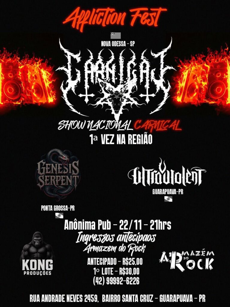 Evento sempre esperado na cena musical de Guarapuava, a Affliction Fest tem como principal atração, no próximo dia 22 de novembro (sábado), o show nacional da banda Carniçal (Nova Odessa-SP) @carnical_ . Será a primeira vez deles na região.