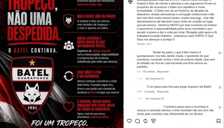 Em postagem publicada neste domingo (26), o clube guarapuavano escreveu é que “esse não é o fim, mas um novo começo”, acrescentando que o futebol é formado por vitórias e derrotas e de que o propósito de reconstruir o Batel segue firme, com equilíbrio e honestidade.