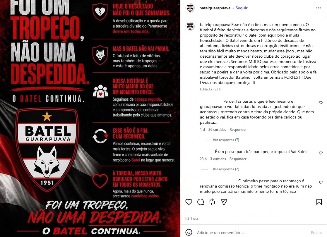 Um dia após o jogo que levou o Batel Guarapuava ao rebaixamento à Terceira Divisão do Paranaense, o clube se manifestou em suas redes sociais.