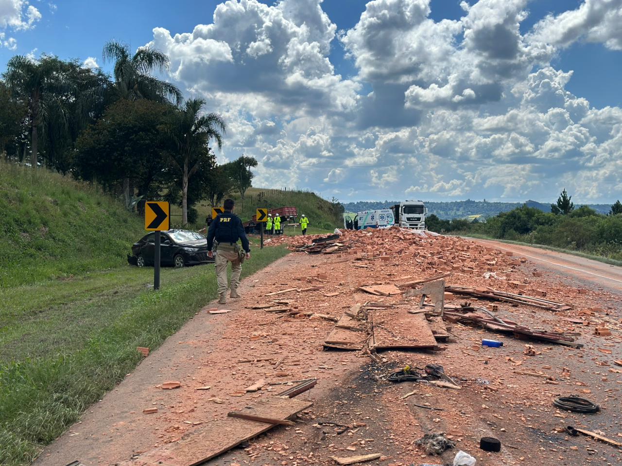 O acidente ocorreu após a carga de tijolos transportada por um caminhão começar a se desprender durante o deslocamento. Em razão do derramamento, o condutor perdeu o controle da direção, resultando na saída de pista.