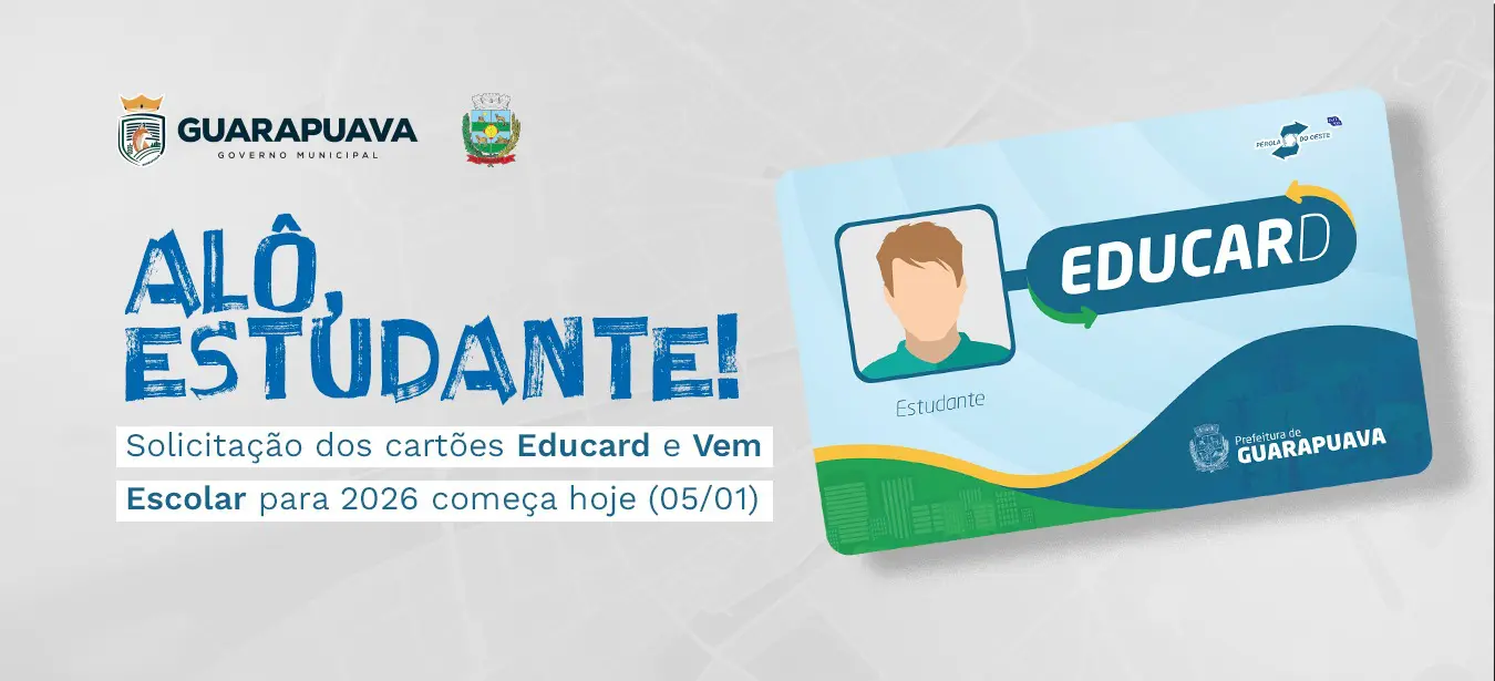Em Guarapuava, começou o período de solicitação dos cartões Vem Escolar e Educard, válidos para o ano de 2026. O pedido deve ser feito exclusivamente de forma online, por meio do Portal do Aluno, disponível no site da Transportes Coletivos Pérola do Oeste.
